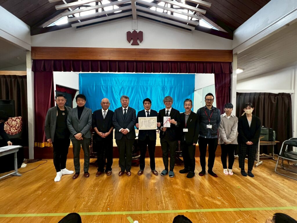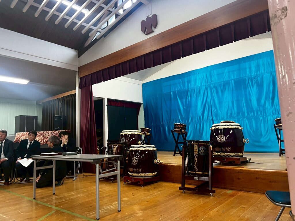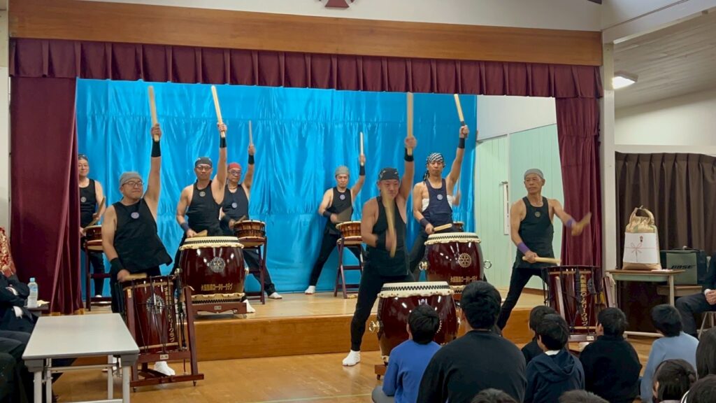 立花会長のご挨拶のもと、贈呈式が厳かに始まり目録贈呈と心をこめて手書きにてしたためられた感謝状を受理された後に、和太鼓部による演奏がはじまると、雰囲気は一変し、荘厳ながらも子どもたちに寄り添った柔和なアレンジにて一体感が生まれ、和太鼓体験については、我先にと太鼓を奪い合い、底抜けに明るい笑い声と和太鼓の音が響きわたりました。